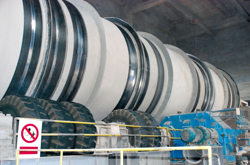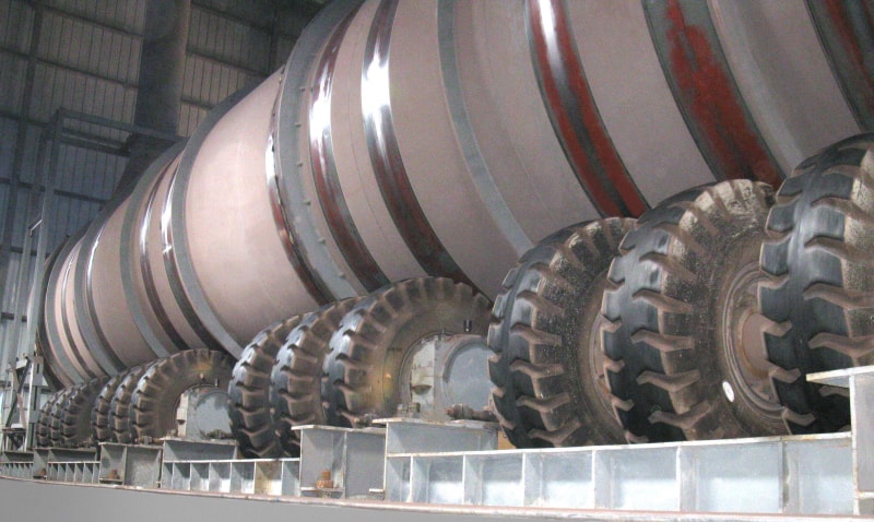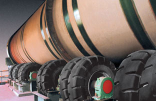 16.00-25規(guī)格海綿實(shí)芯輪胎配套在日照鋼鐵有限公司3.4米x14米混料機(jī)上
